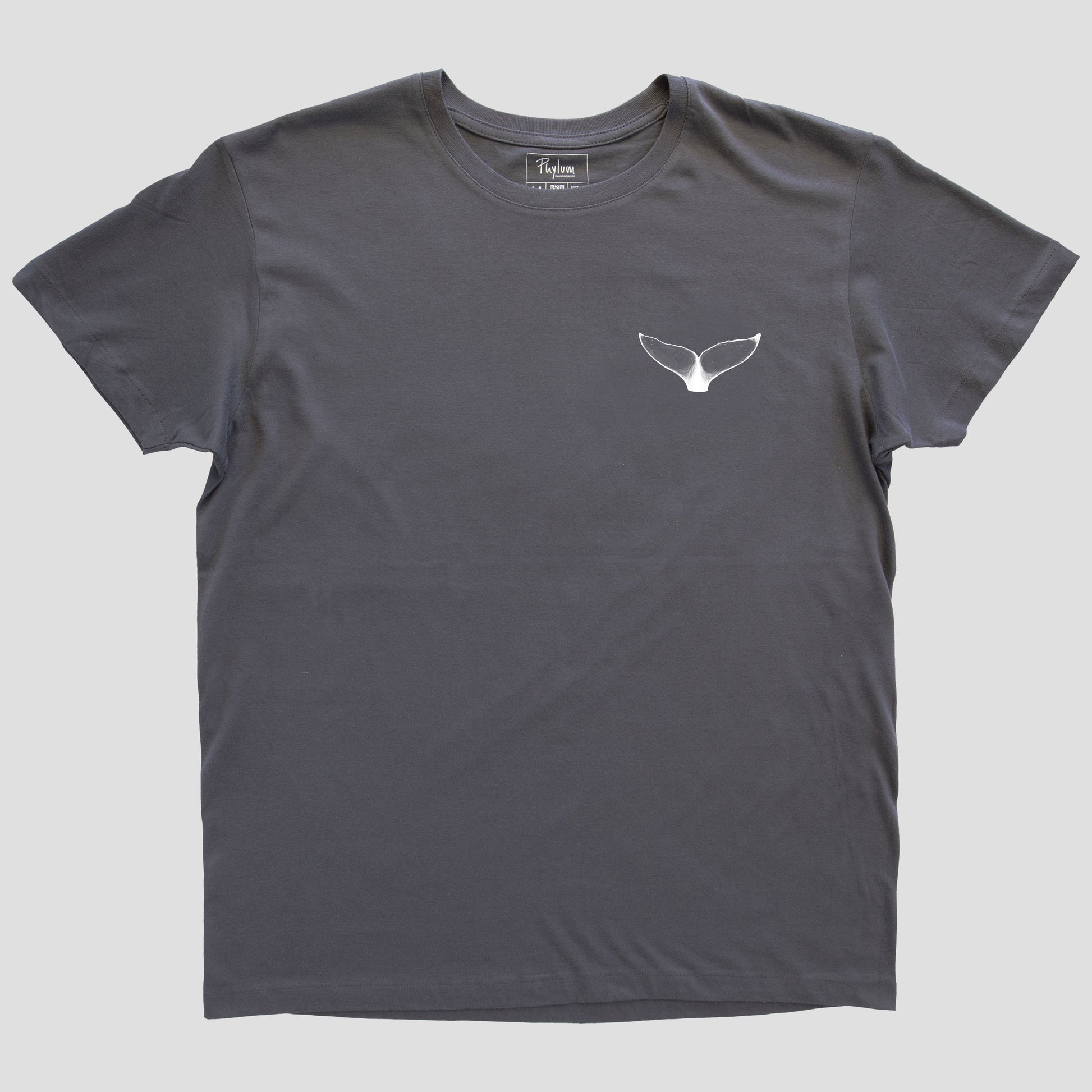 Esta cómoda polera manga corta trae un estampado en la parte frontal y de atrás. En la delantera se puede ver la aleta caudal o cola de la ballena y en el reverso de la polera una ilustración del salto de la jorobada.